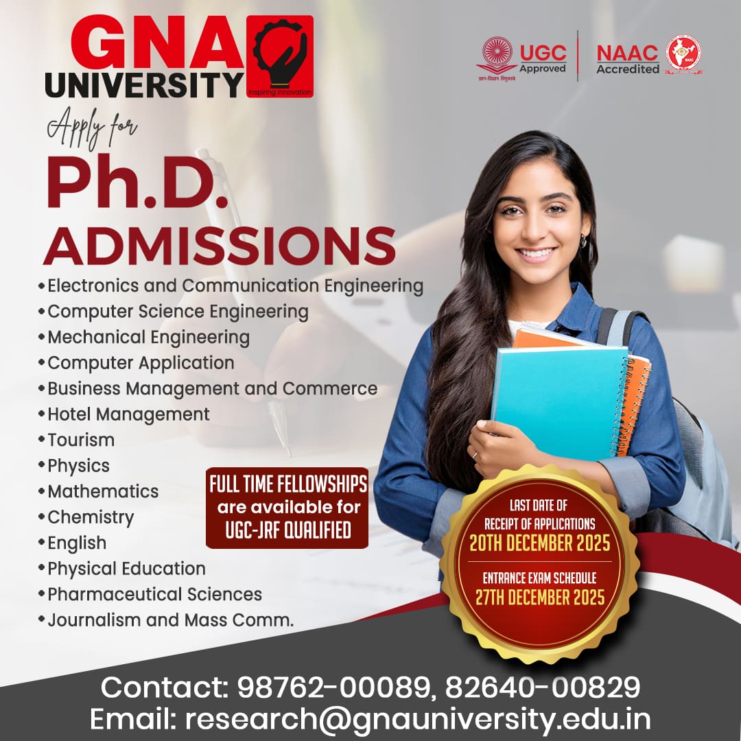 GNA University invites applications for Ph.D. Program as per below criteria and procedure for admission:-